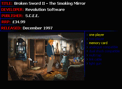 Yes you've guessed it. He's back...After a phone call from Nico about an ancient Mayan artefact that she has discovered our hero George Stobbart heads off to Professor Oubier's mansion to meet the lovely Nico and get the low down on the stone. If only life were that simple! There's no sign of the Professor, Nico then gets kidnapped and then George regains conciousness to find himself tied to a chair with the room ablaze and a poisonous spider about to sink its fangs into his skin. Welcome to Broken Sword 2 - The smoking mirror. Wherever he seems to go, trouble just seems to follow him. But now he's a man on a mission and he won't rest until he finds his girl.