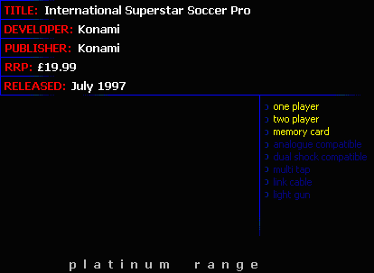 Football simulations are ten-a-penny these days. There are so many but nobody seems to be able to take the best bits from each one and create the ultimate soccer game. ISS Pro comes very close to the ultimate soccer game but just misses that elusive title by a whisker. In comparison with a lot of other footy games it actually plays like a real match. You can pass the ball around with ease and accuracy slowly building up and then inject a bit of pace as you skin a defender down the by-line. It utilises the 3D persective view for the games as most do nowadays and it looks good. It also plays very well. Once you have mastered the controls it is good fun and quite easy to play. The players move along smoothly and at a glance you could almost be watching a real match. Only international teams are available which is a shame but there are different types of competitions available. The controls on the pad make use of the short pass, long pass, shoot and through ball options while combining these with the shoulder buttons will add tricks and flicks. The "through ball" pass is an excellent move as once the ball has left the foot of one player, his counterpart will automatically start running in between defenders to latch on to his pass which adds that touch more realism.